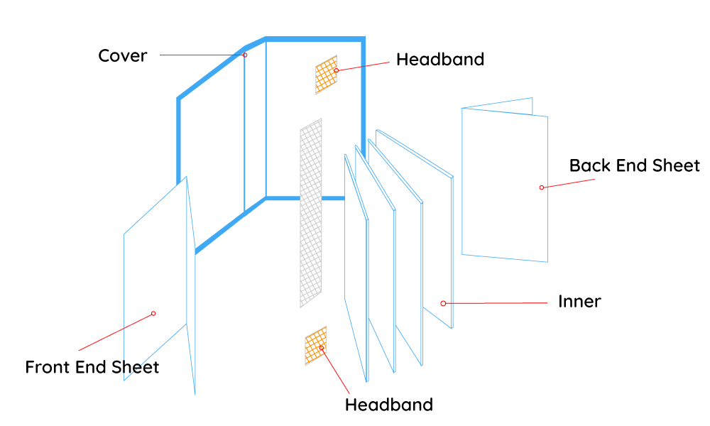 End sheet paper is used to connect the cover and the inner pages. A flexibound book includes both front endpapers and back endpapers. The front endpaper is pasted to the inside of the front cover and the first page of the inner block. The back endpaper is pasted to the inside of the back cover and the last page of the inner block. Once attached, the endpapers neatly cover the turned-in edges of the cover, creating a clean, finished appearance on the inside of the book. End sheet papers that connect the cover to the inner pages, helping the book open smoothly and providing structural stability. - Inner Pages