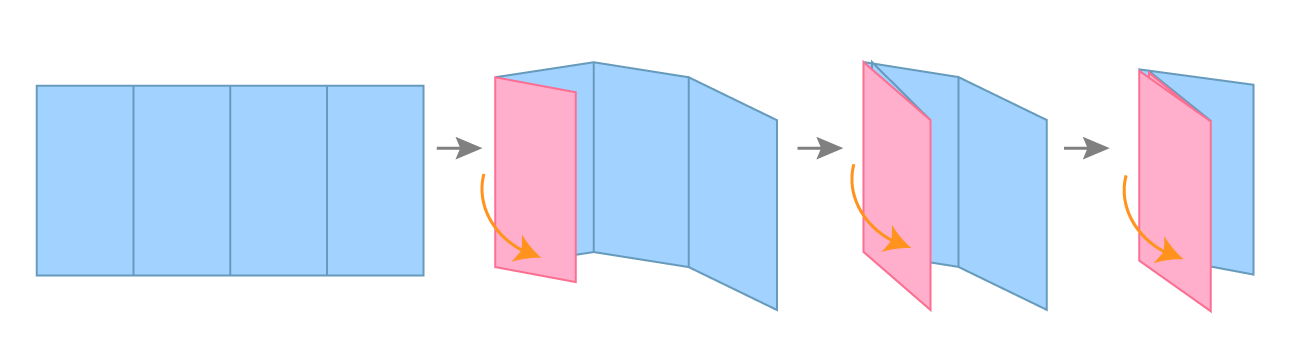 A roll fold works by folding each panel inward in the same direction — always toward the center — so that each panel wraps around the one before it. This is what distinguishes it from an accordion fold, where panels alternate direction.